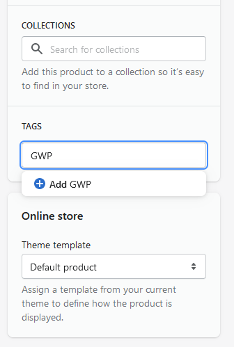 To do this, open the product in Shopify and add the tag to the product. In this example, we're using the tag GWP, but you can choose a different name for your tag: